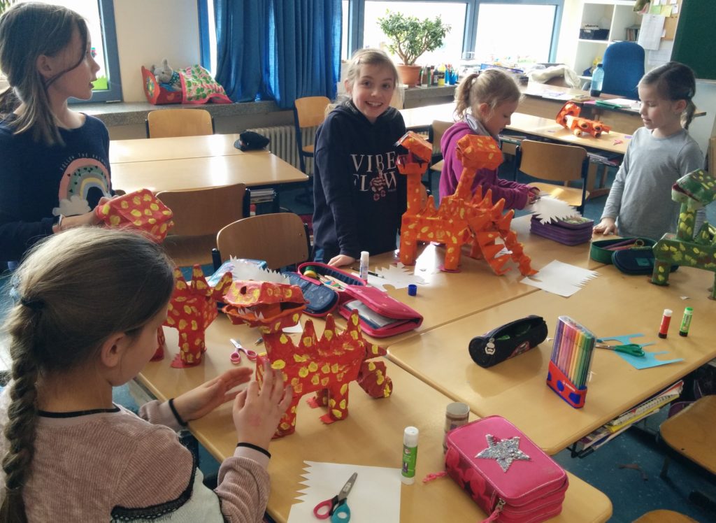Da aber aber nahezu keine Farbteilchen auf den Fossilien zu finden waren, ließen die kleinen Forscher bei der farblichen Gestaltung der Dinos ihrer Fantasie freien Lauf.