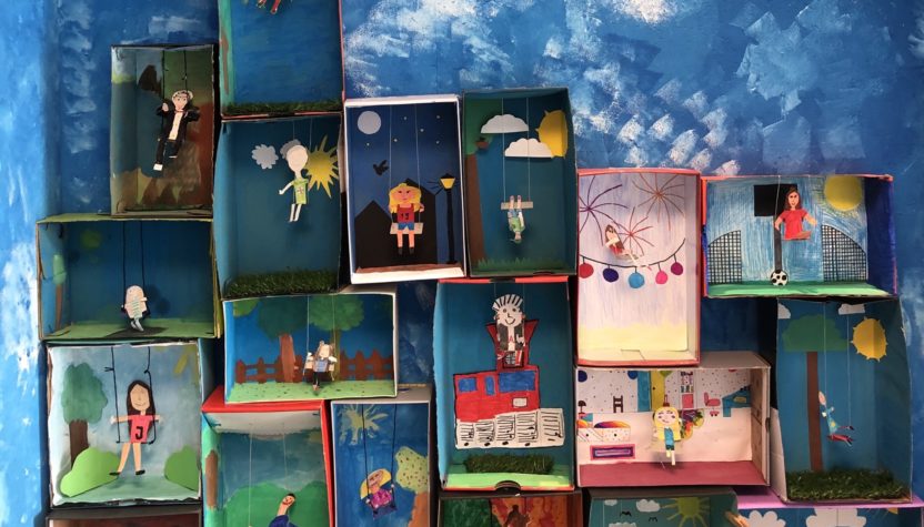 Die Klasse 4b bastelte im Kunstunterricht Schaukeln im Schuhkarton.