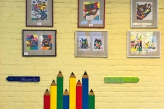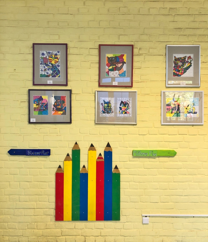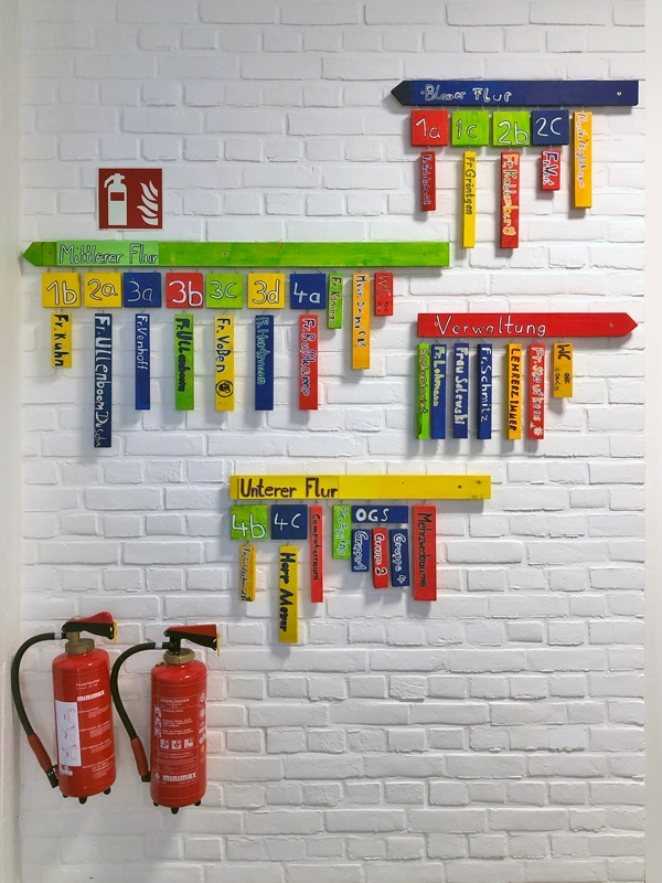 Die Arbeitsgemeinschaft „Kunst & Werken“, geleitet von Frau Steufkens, erstellt Wegweiser zur besseren Orientierung in der Schule.
