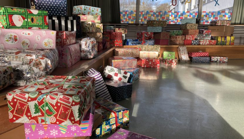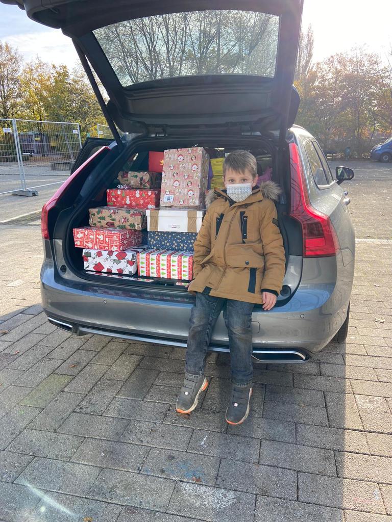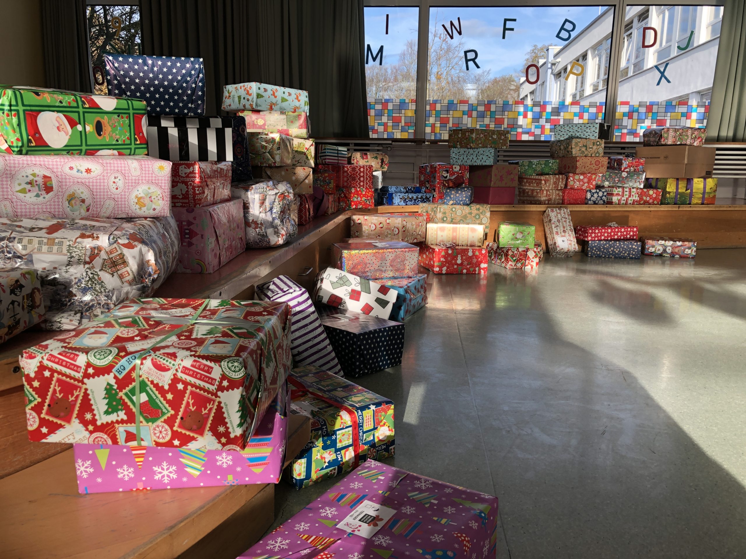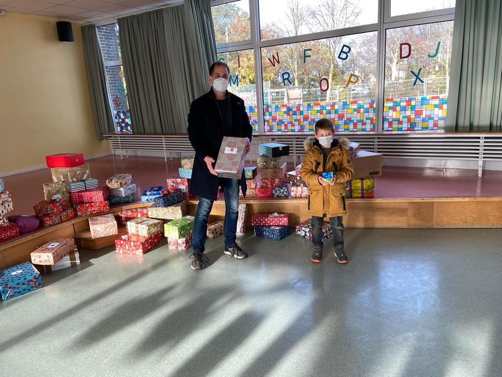Am Freitagvormittag wurden alle Päckchen abgeholt. 1407 Päckchen wurden am Niederrhein für die Aktion „Weihnachten im Schuhkarton“ gepackt. Der Präsident von „Round Table“ Thomas Staczan hat die Päckchen gemeinsam mit Nikolas aus der 2a verladen.