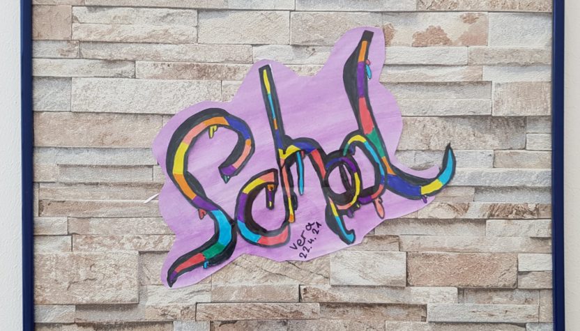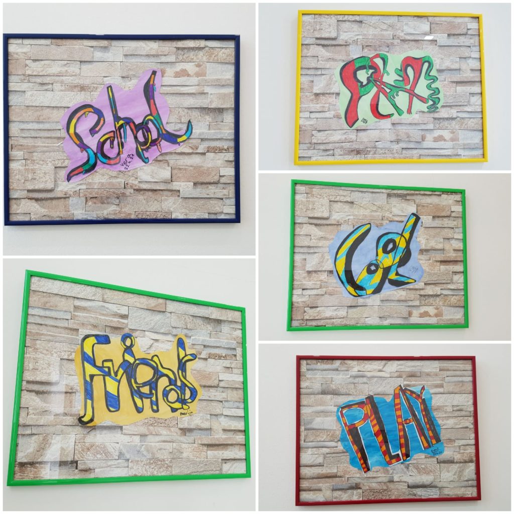 Ausgewählte Bilder hängen nun in Rahmen im Treppenaufgang zum Neubautrakt und den Klassen 2a und 4a. Die kunterbunten Graffitis machen nun die einst so kahle, weiße Wand zu einem besonderen Blickfang!