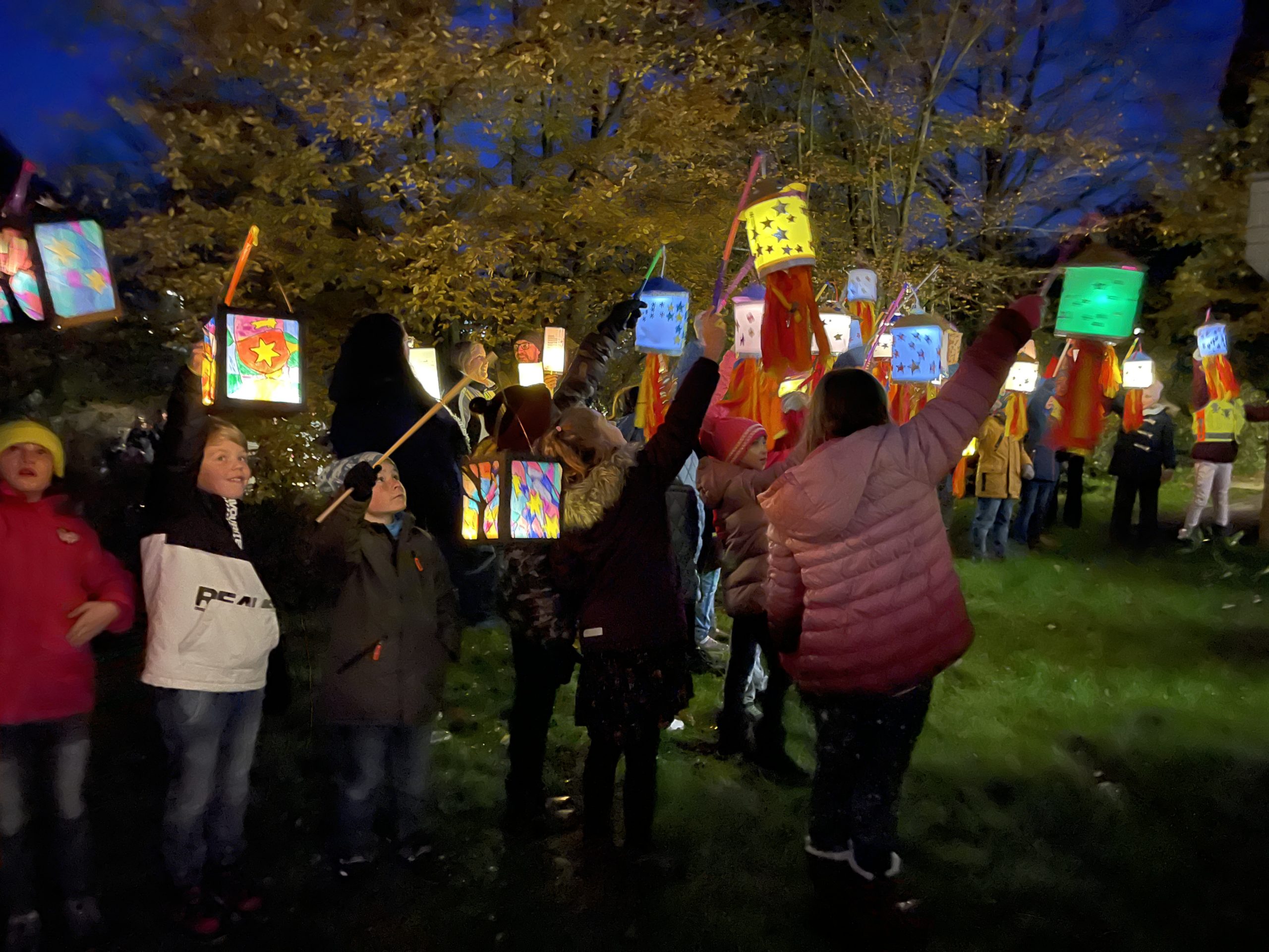 Mit ihren selbstgebastelten Laternen bestaunten alle Jahrgangsstufen das kleine Theaterstück der Klasse 3a auf dem Schulhof.