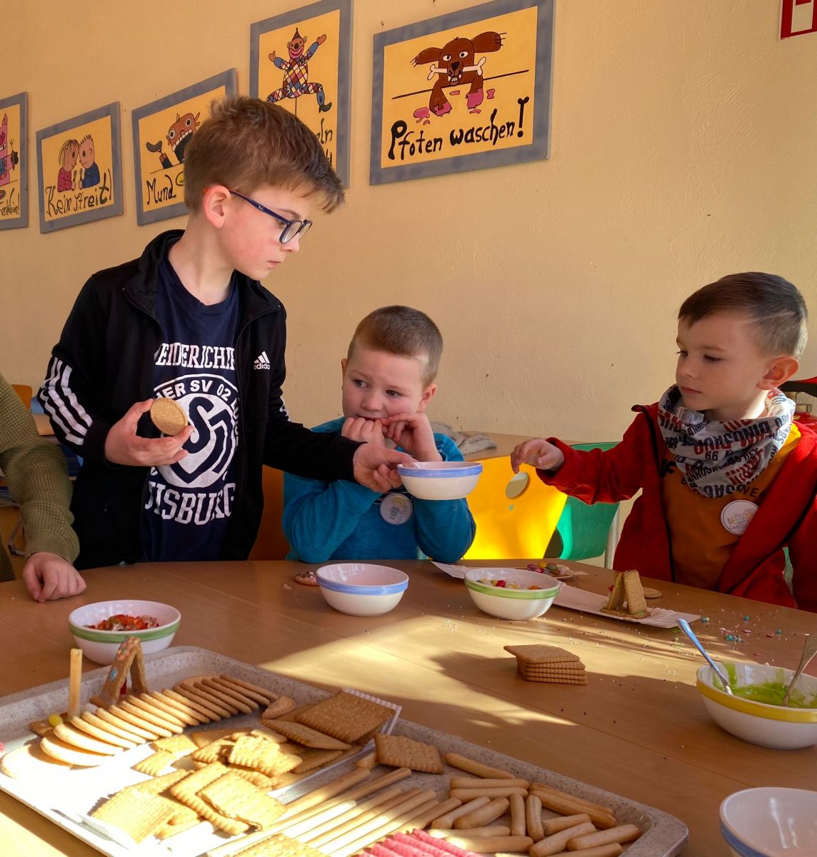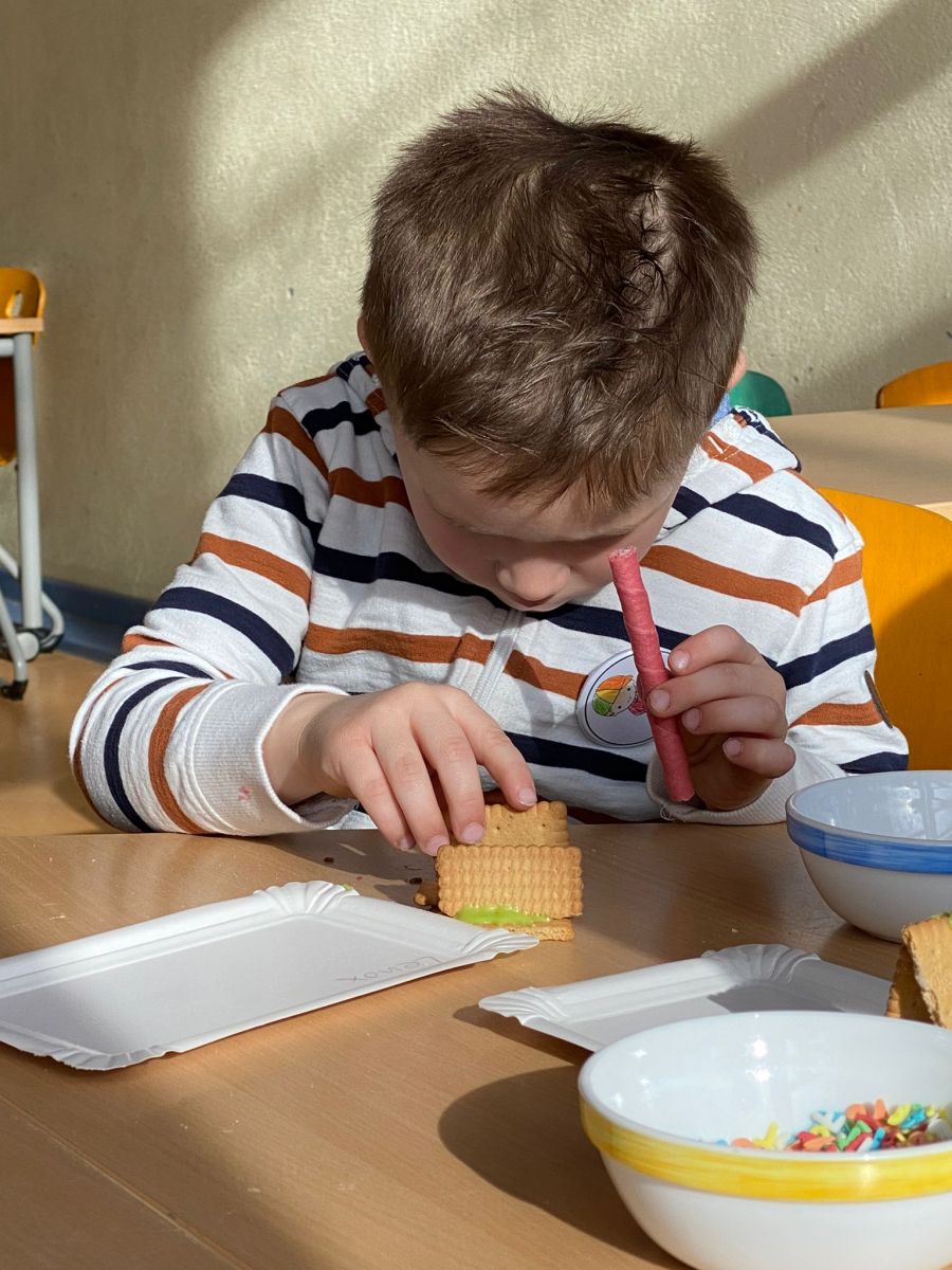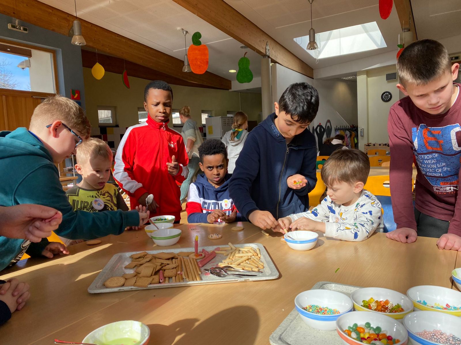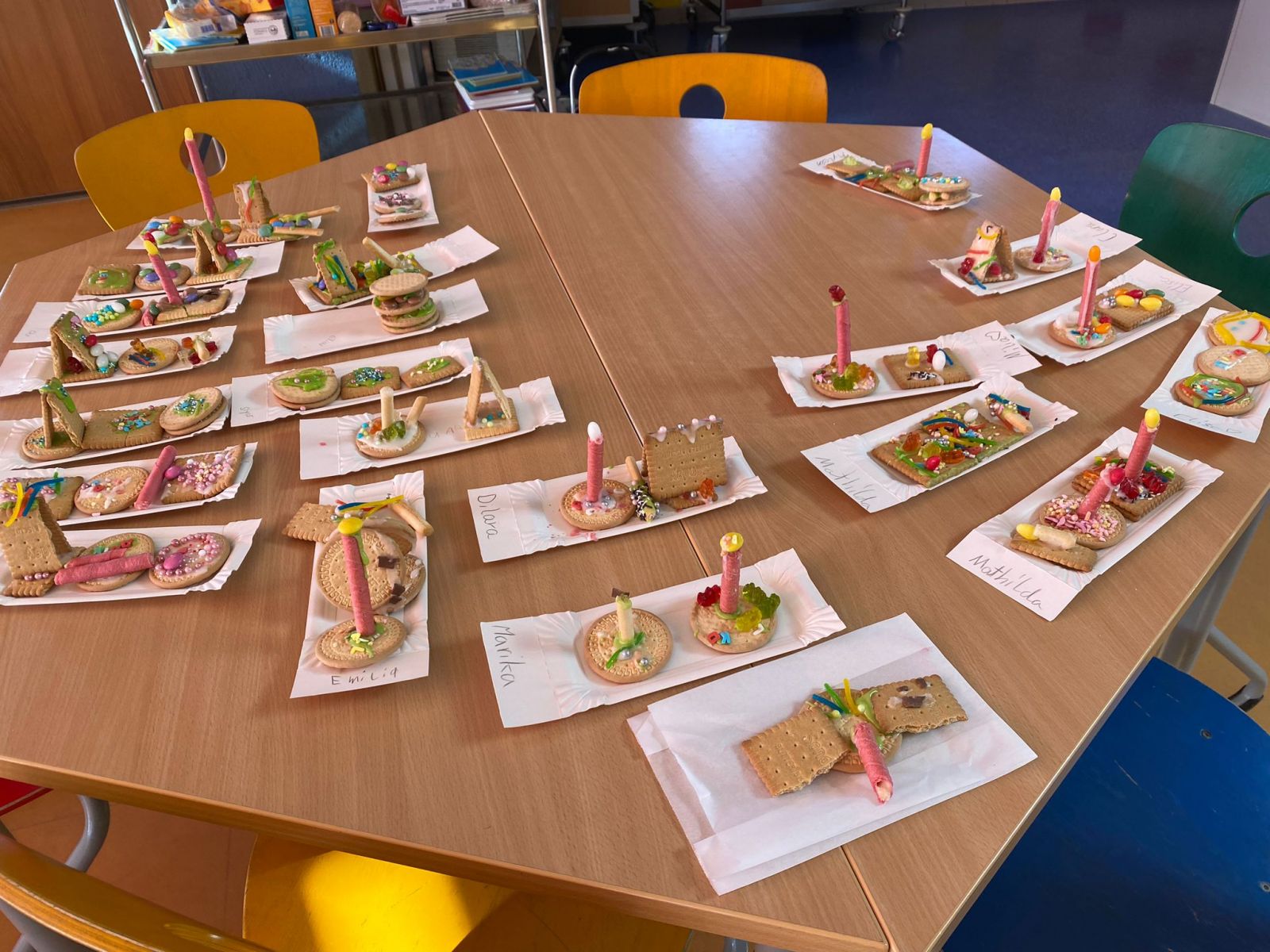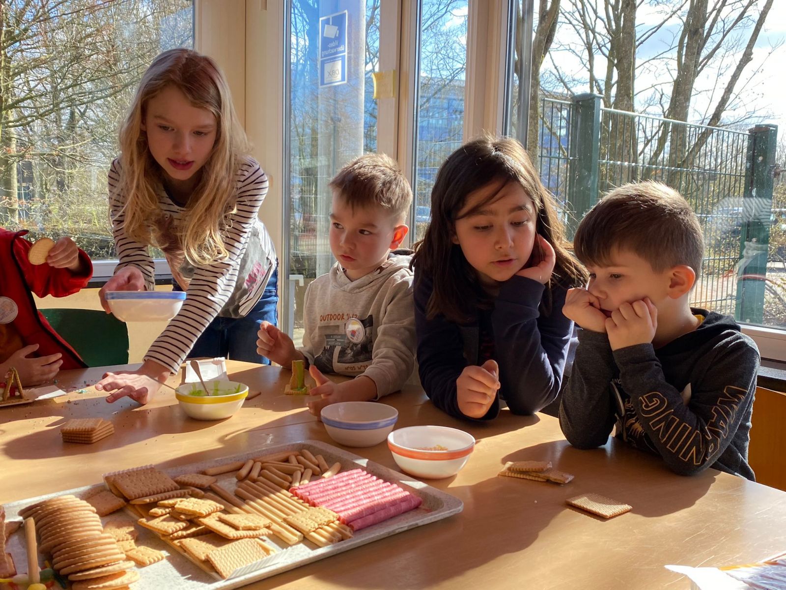 In der vergangenen Woche haben uns die Vorschulkinder aus den umliegenden Kitas besucht, um gemeinsam mit den zukünftigen Paten aus den dritten Klassen einen geselligen vorösterlichen Nachmittag zu verbringen. Es wurde aus dem Buch „Das schönste Ei der Welt“ vorgelesen, dazu gemalt und Kekse wurden mit viel Puderzucker lecker dekoriert. Hierbei entstanden Häuser, Kerzen, Elefanten, Keksburger und allerlei kreative Kunstwerke.