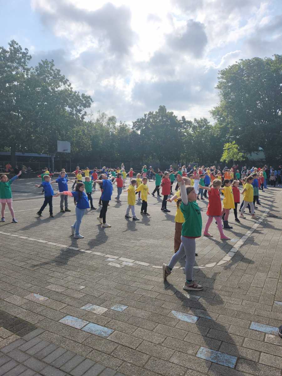 Die Stufe 3 zeigte zusammen mit Frau Bußkamp einen Ausschnitt aus dem Musical „Löwenmutig & tigerstark“, was Kinderaugen zum Leuchten brachte. Die SchülerInnen in Marienbaum wurden ebenfalls mit einem Lied begrüßt.