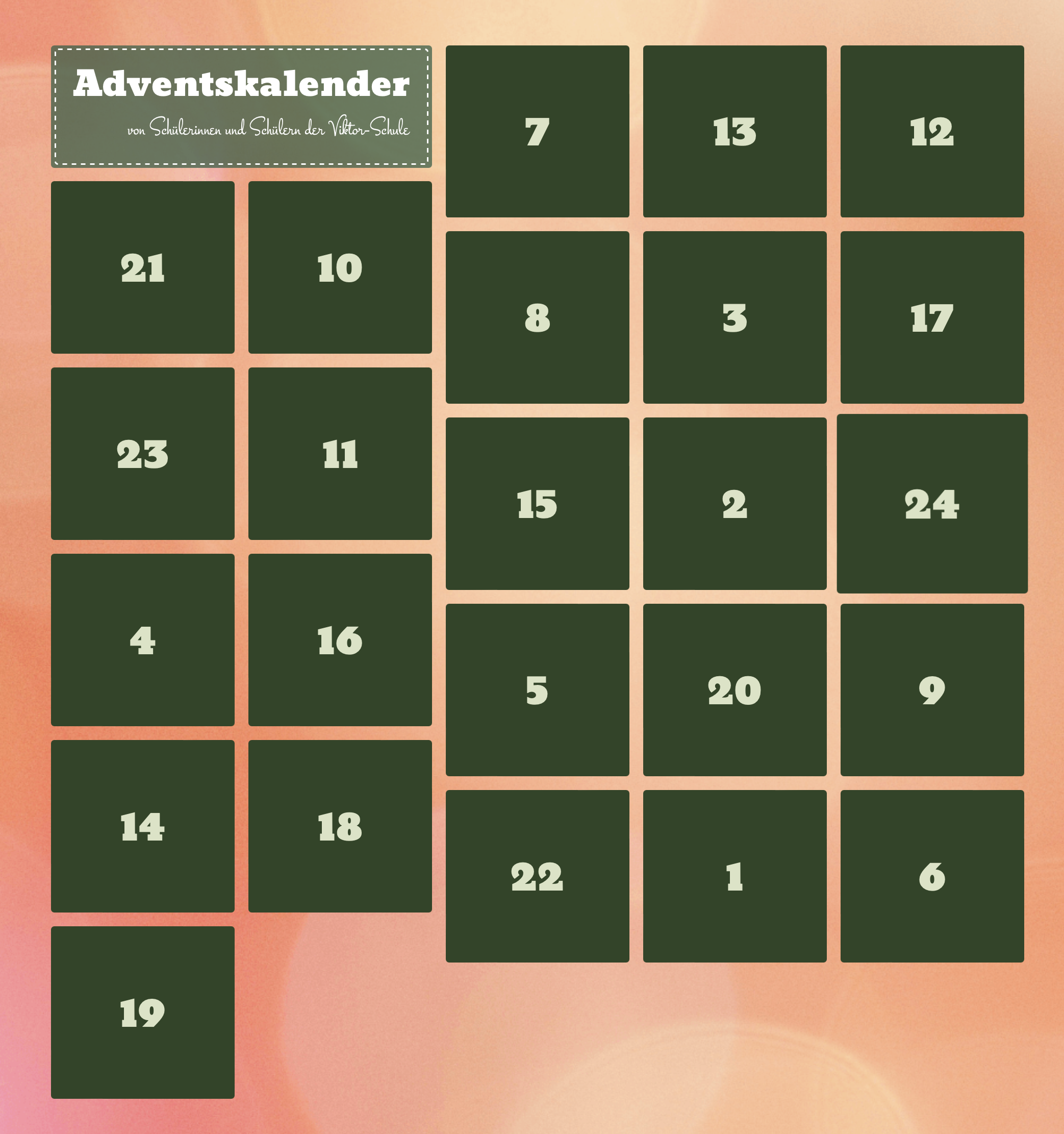 Auch in diesem Jahr haben wieder alle Klassen der Viktor-Schule einen kleinen Karton für unseren gemeinschaftlichen Adventskalender gestaltet,
