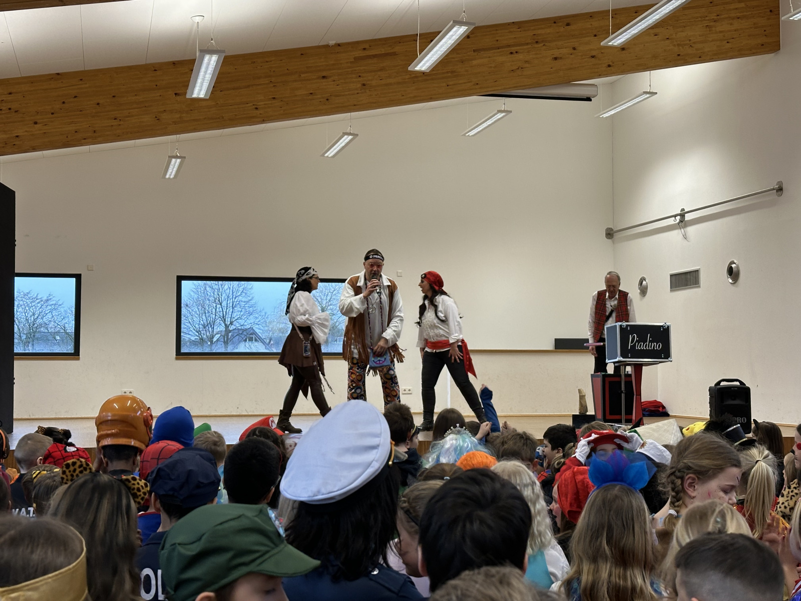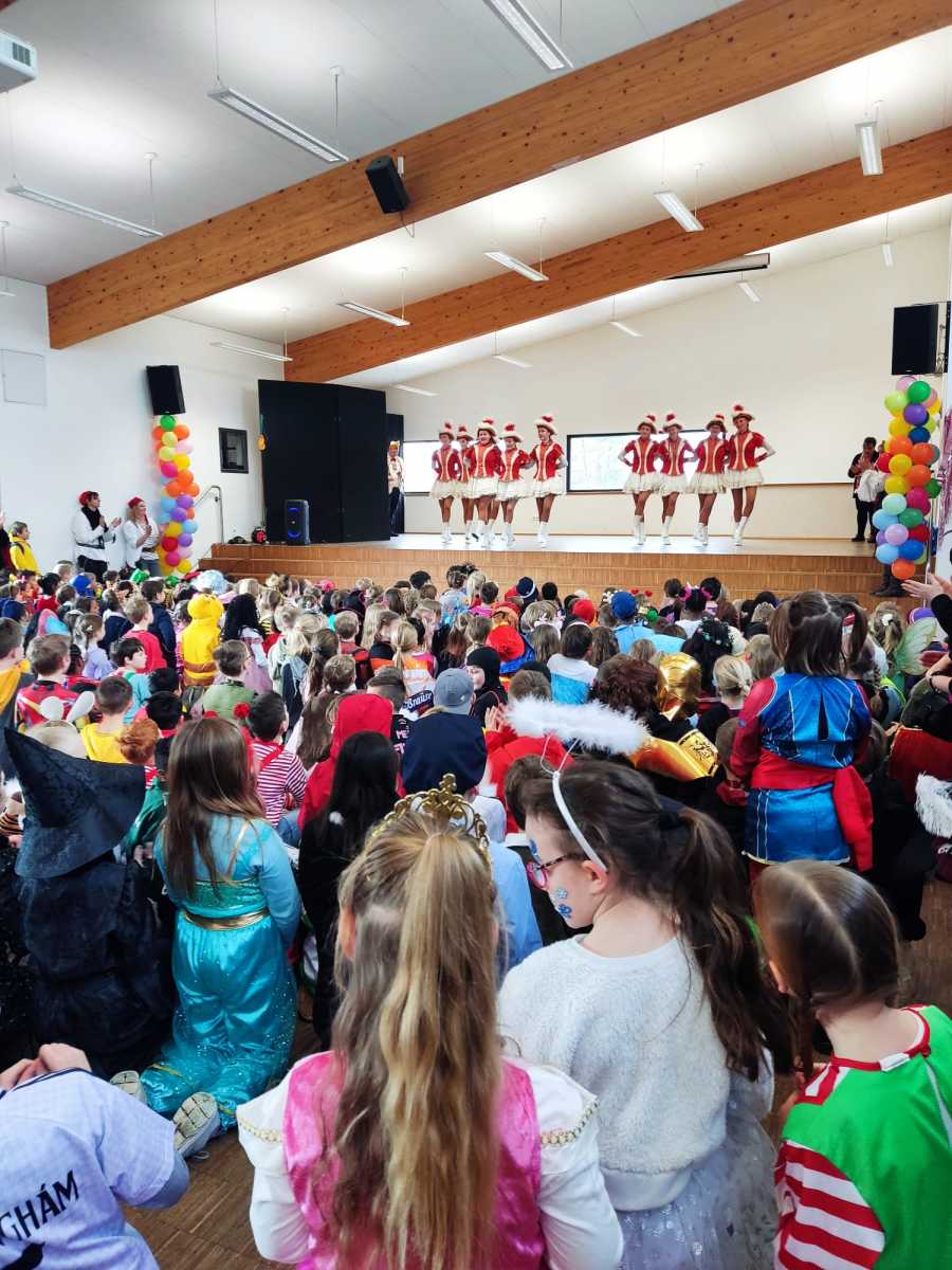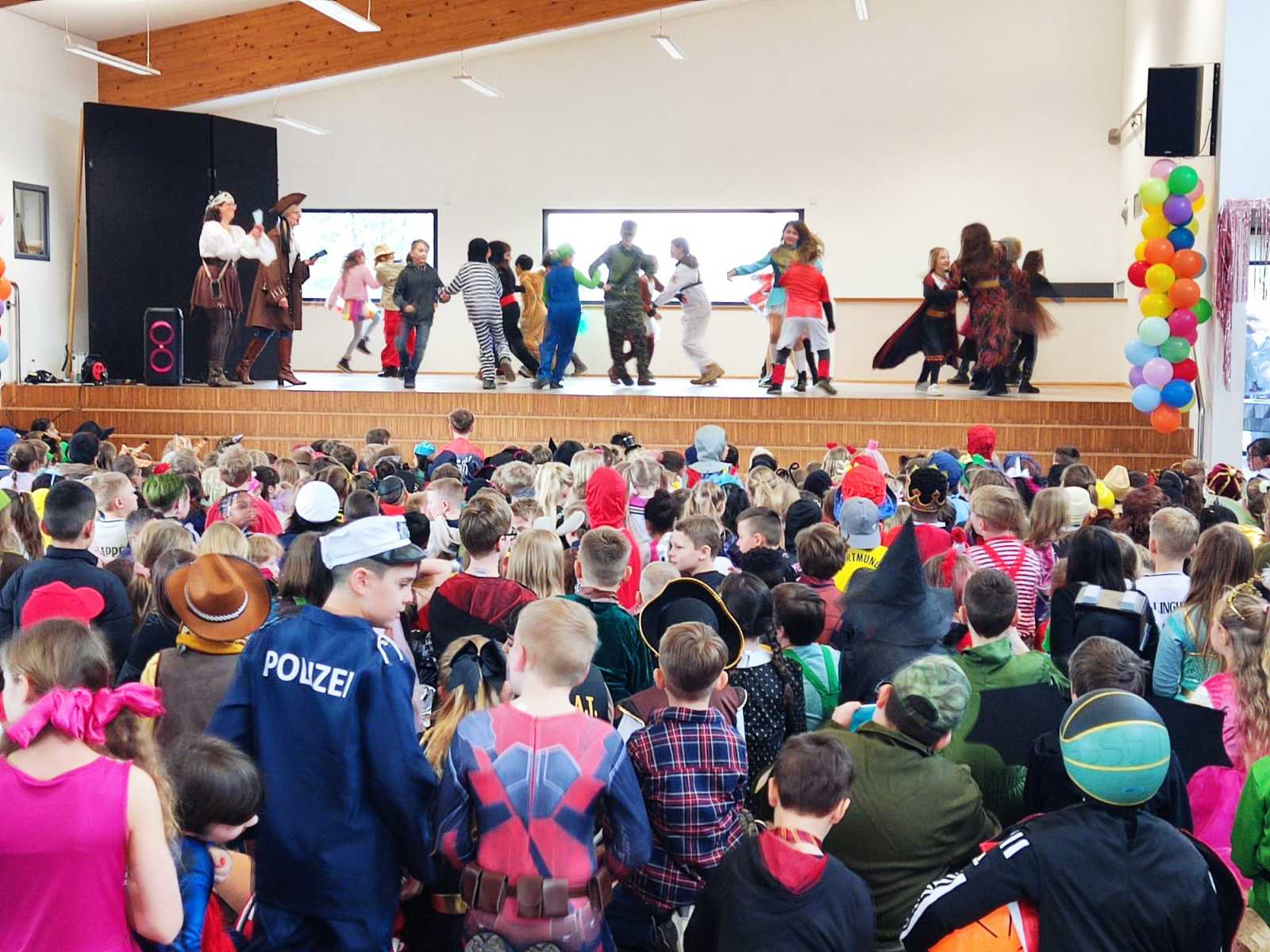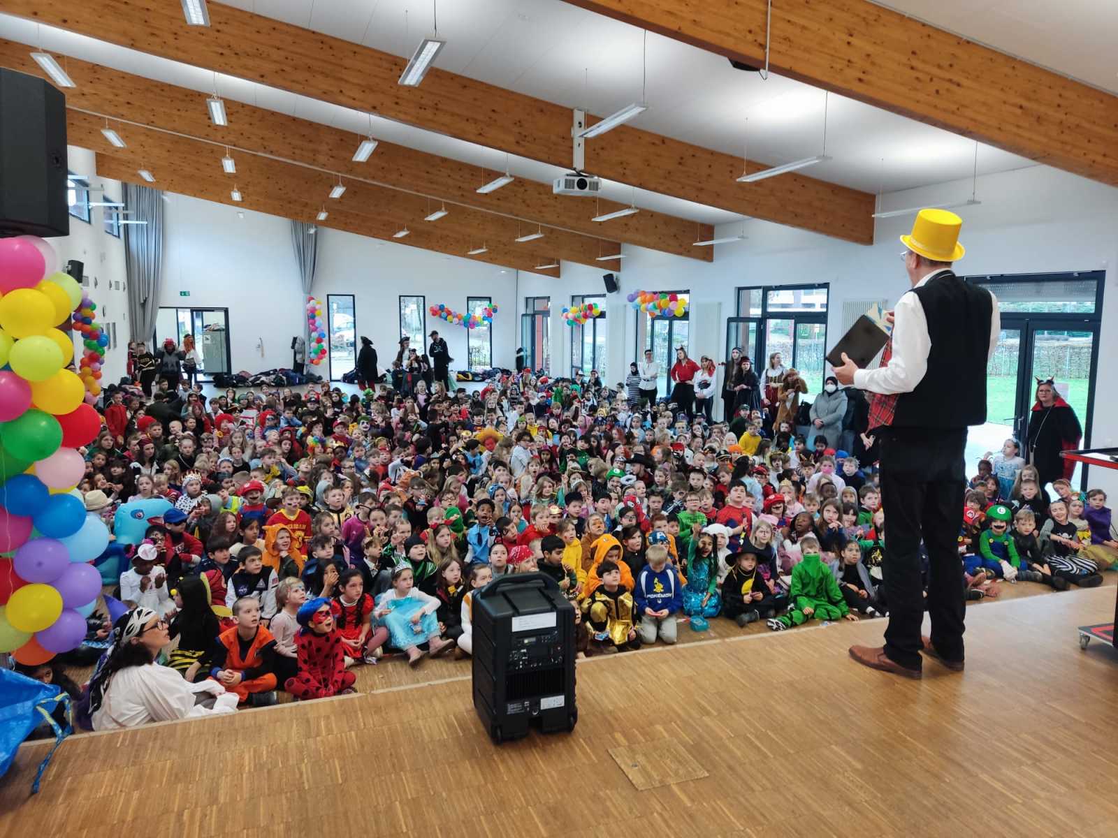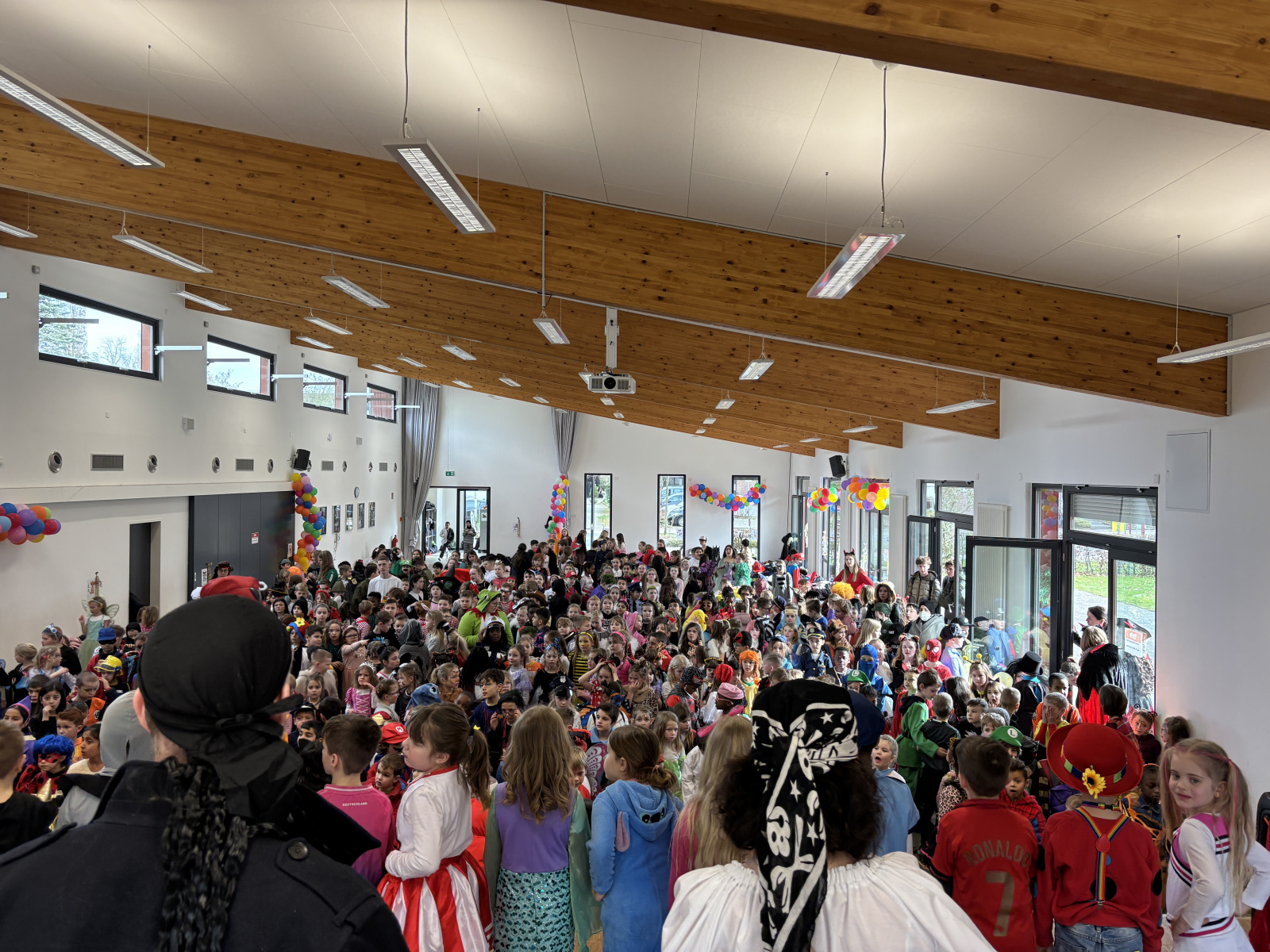 Die Mensa des Gymnasiums war bunt geschmückt und die Vorfreude war spürbar, als die Kinder in ihren phantasievollen Verkleidungen eintrafen.