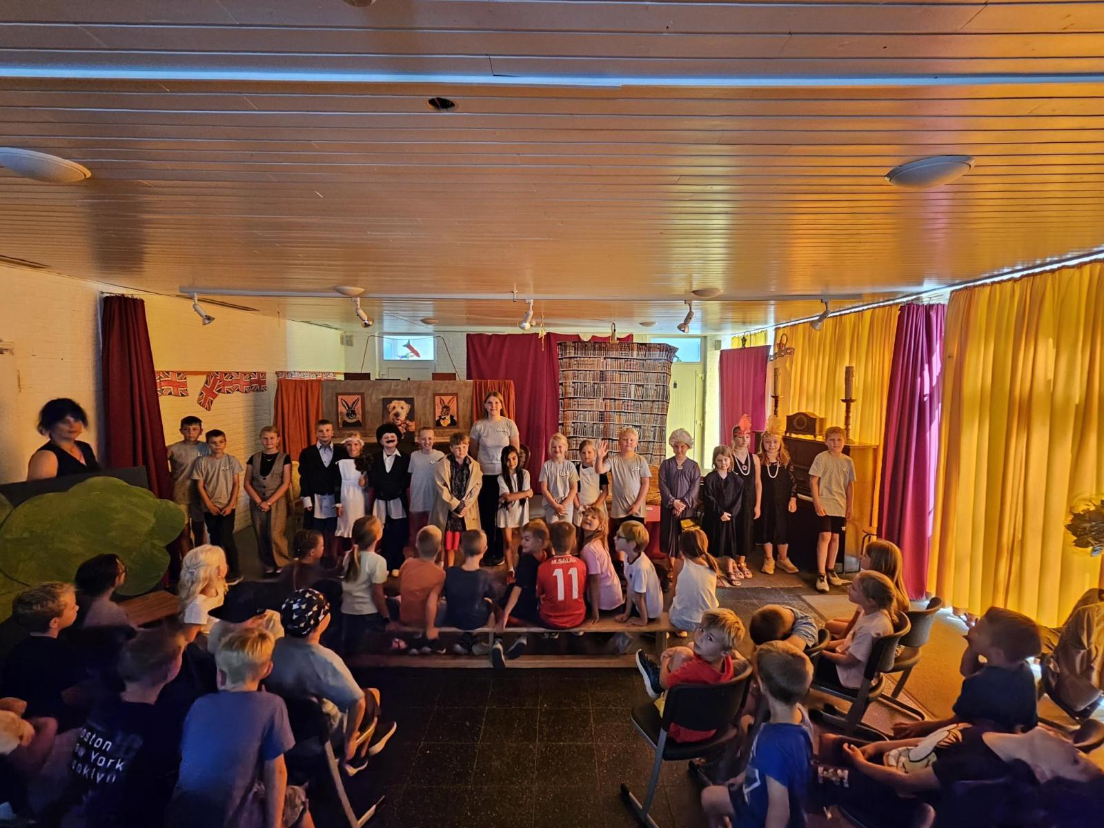 Am Freitag, den 04. Juli 2025 war es endlich so weit: Die Theater-AG unserer Grundschule am Standort Marienbaum präsentierte erstmalig ihr selbst erarbeitetes Theaterstück „Ein Wochenende auf Schloss Baskerville“. Seit Januar hatten die 16 jungen Schauspielerinnen und Schauspieler wöchentlich geprobt, um die Zuschauer mit einer spannenden und humorvollen Kriminalgeschichte zu begeistern – und das mit großem Erfolg!