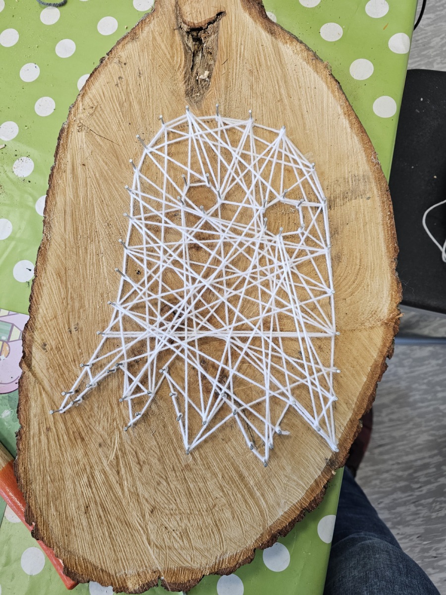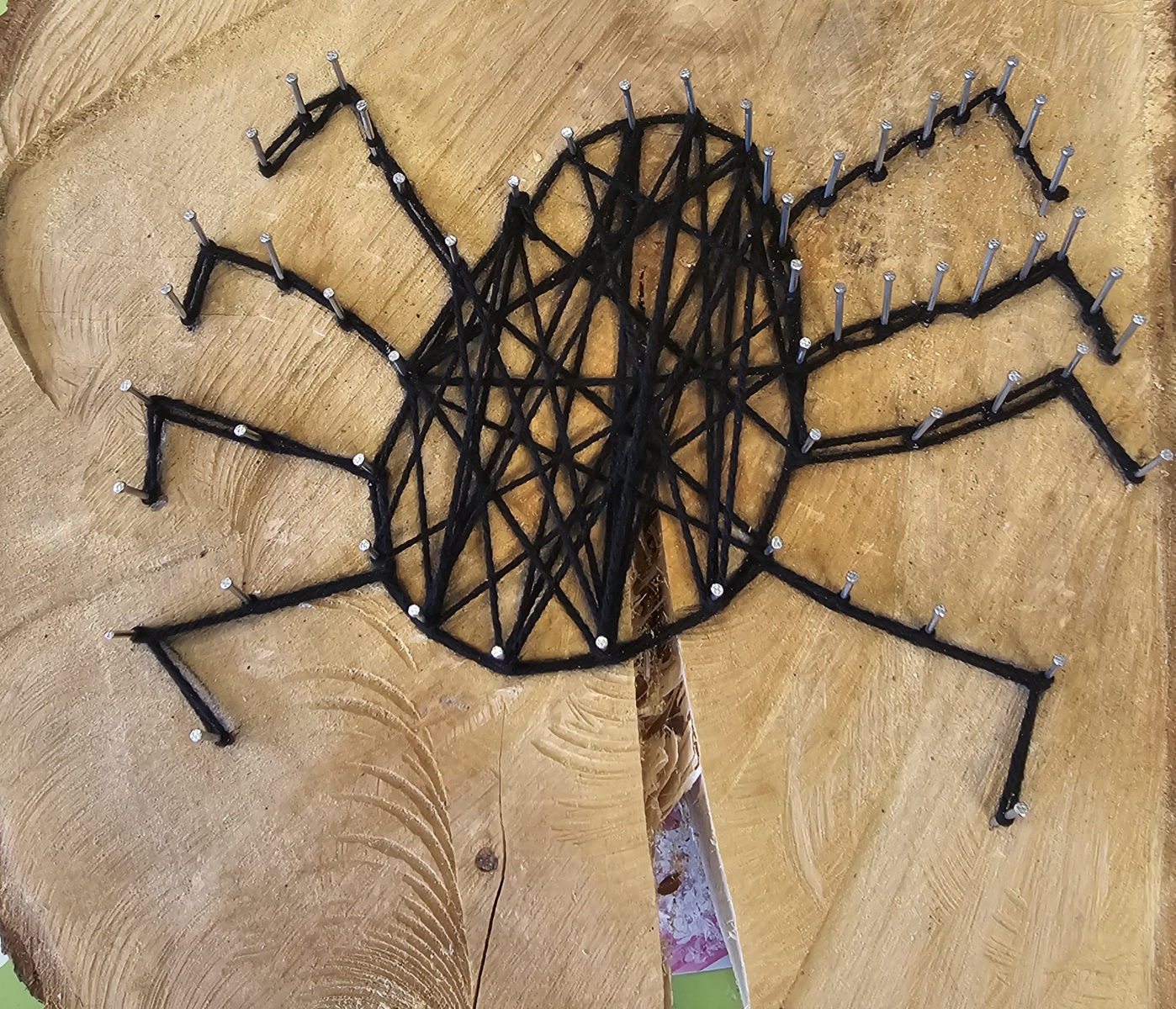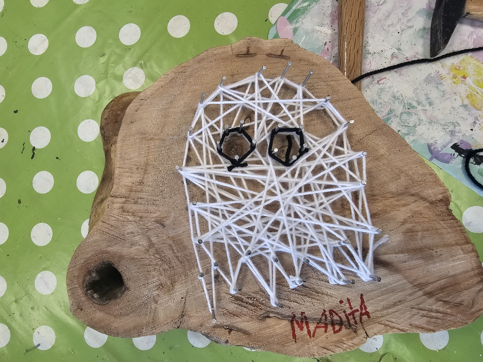 Mit viel Freude und Begeisterung haben sie gruselige Motive wie Spinnen, Geister und Fledermäuse auf Holzplatten umgesetzt. Dabei wurden Nägel vorsichtig in die vorgezeichneten Konturen gehämmert und anschließend mit bunten Fäden bespannt.