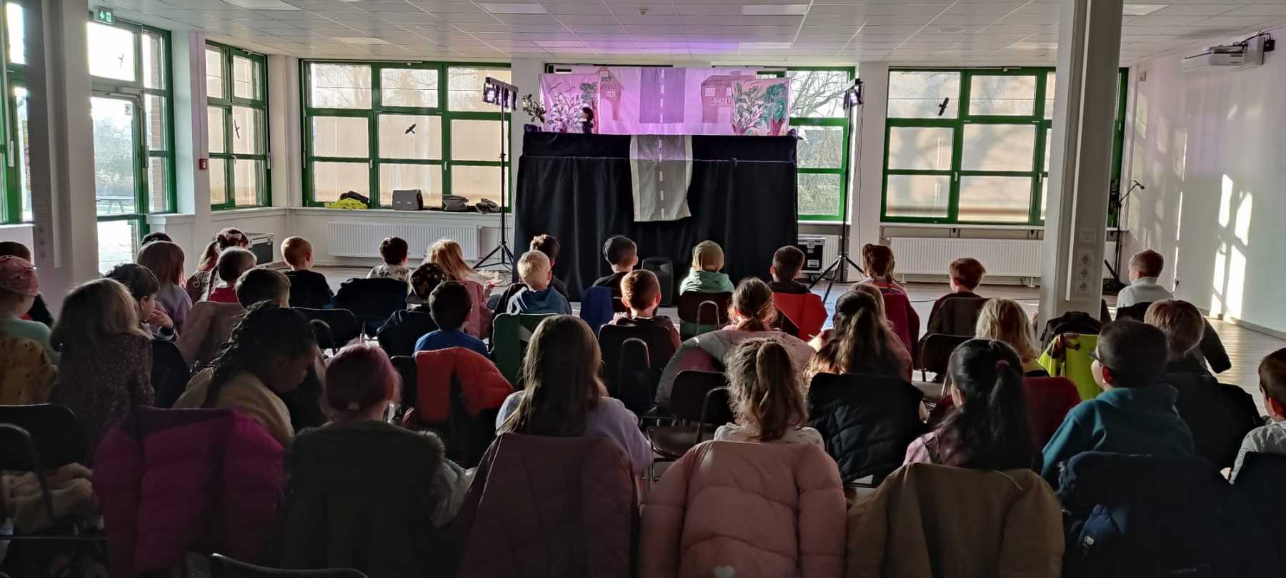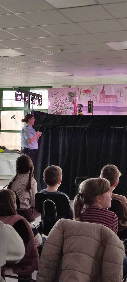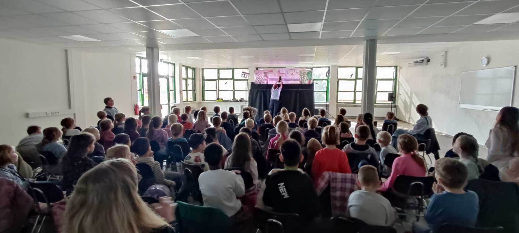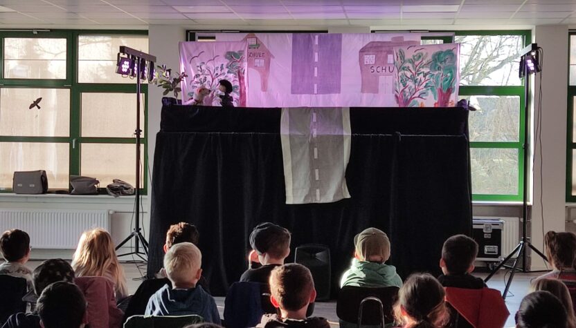 An der Sekundarschule angekommen, wurden die Schülerinnen und Schüler herzlich von Frau van Geldern und ihrem Team der Polizei empfangen. Dort erwartete sie ein fröhliches Puppentheater, das mit vielen lustigen Momenten die wichtige Botschaft vermittelte, wie man sich sicher im Straßenverkehr verhält.